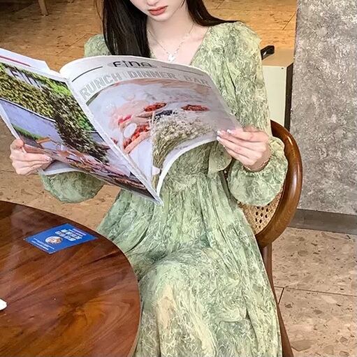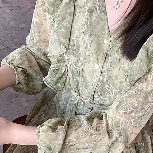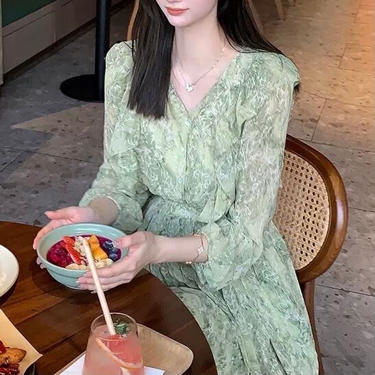 OP-0070 グリーン Vネック フローラル ドレス レディース ガーリー 膝下丈 ワンピース オールインワン レディース シンプル 可愛い お洒落 半袖