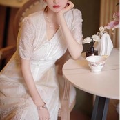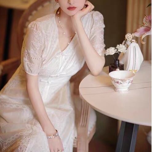 OP-0072 Vネック ドレス レディース ガーリー 膝下丈 ワンピース オールインワン レディース シンプル 可愛い お洒落 半袖
