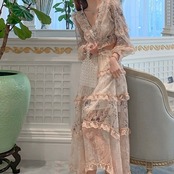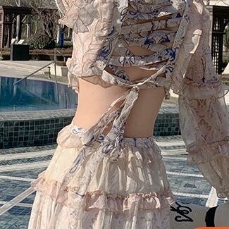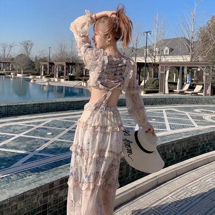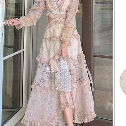 OP-0085 レトロ 花柄 背中あき フェアリーVネック 長袖 シースルー フリル ガーリー ロング丈 ワンピース オールインワン シンプル 可愛い お洒落 カジュアル