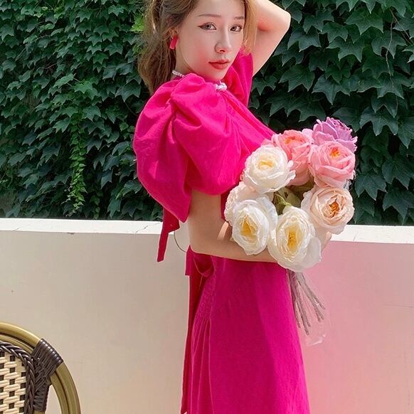 OP-0086 パフスリーブ ビビット 背中あき リボン 半袖 ガーリー 膝下丈 ワンピース オールインワン シンプル 可愛い お洒落 カジュアル
