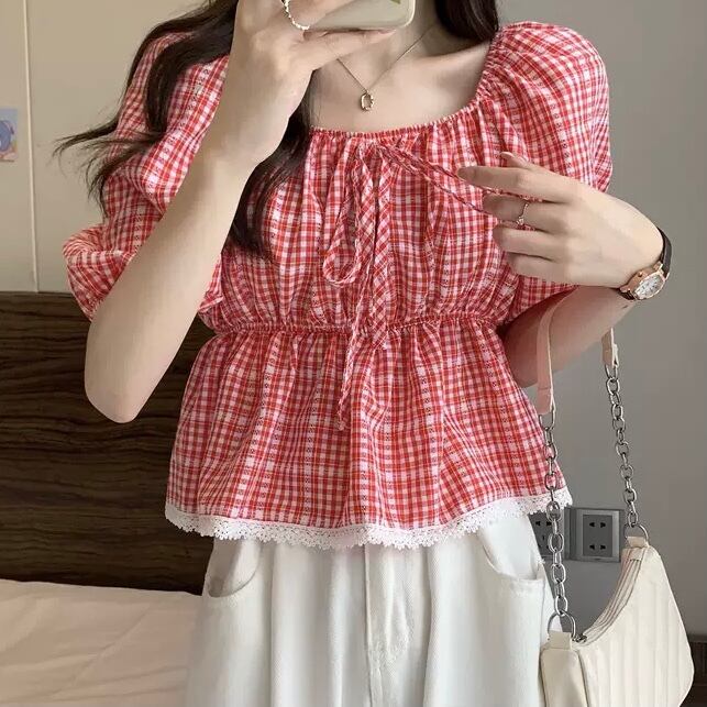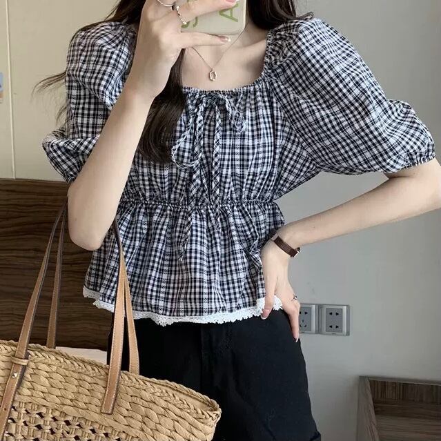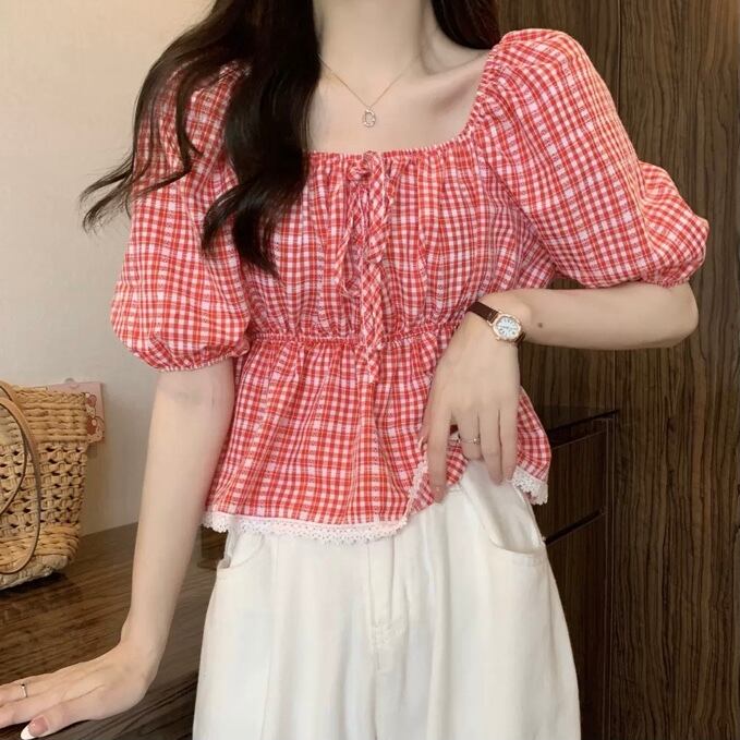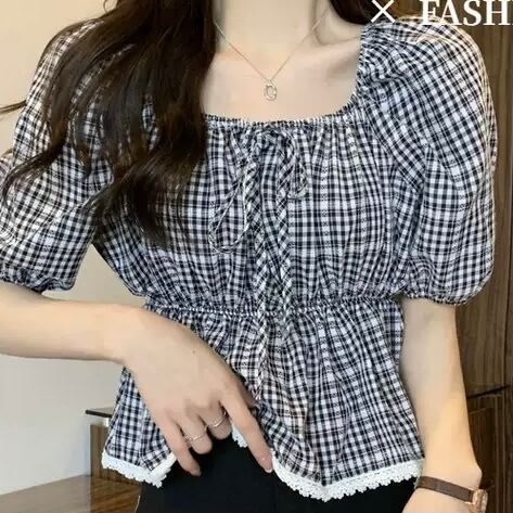 TS-0495 チェック柄 スクエアネック パフスリーブ シャツ スリムウエスト 半袖 トップス レディース シンプル 可愛い カジュアル お洒落