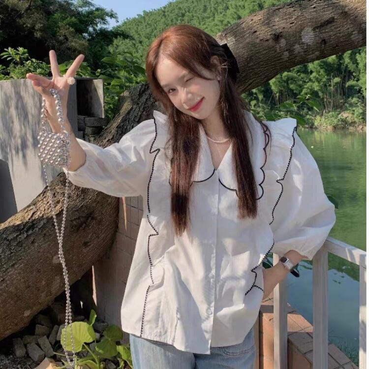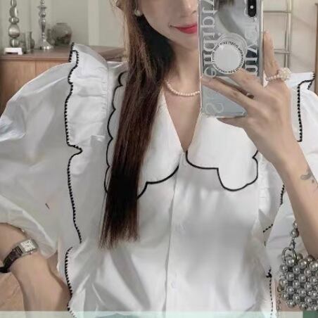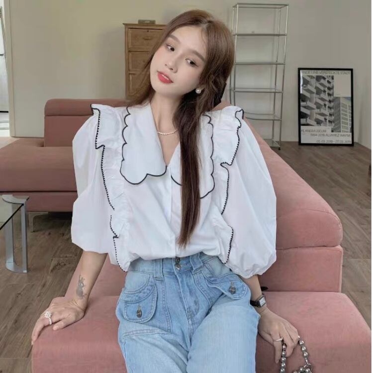 BL-0258 フリル 襟付き 6分丈 ブラウス トップス レディース シンプル 可愛い カジュアル お洒落