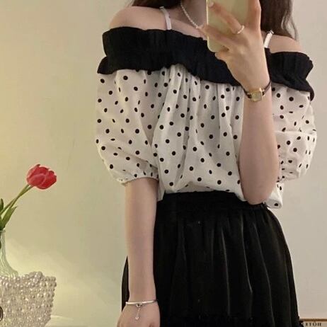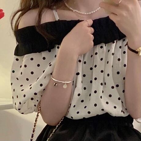 TS-0498 水玉 フリル オフショルダー バイカラー 半袖 トップス レディース シンプル 可愛い カジュアル お洒落