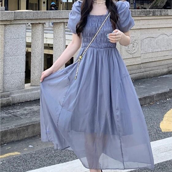 OP-0090 スクエアネック パフスリーブ フェアリー 半袖 シースルー ロング丈 ワンピース オールインワン シンプル 可愛い お洒落 カジュアル