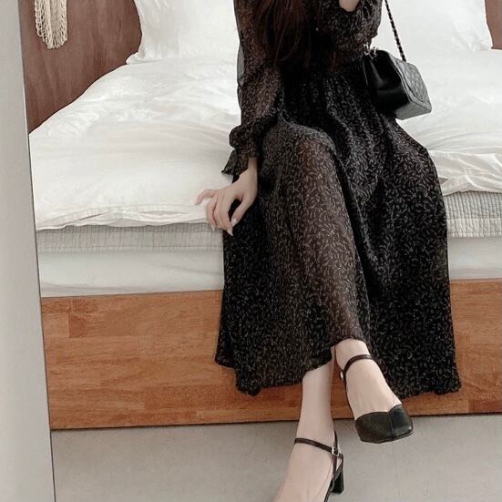 OP-0095 長袖 花柄 Vネック ロング丈 シフォン ワンピース レディース オールインワン シンプル 可愛い お洒落 カジュアル