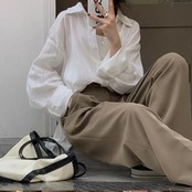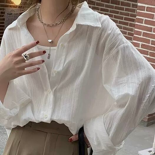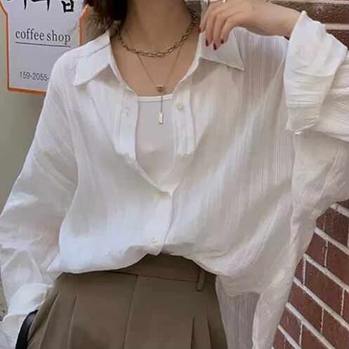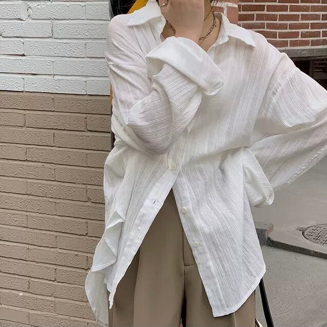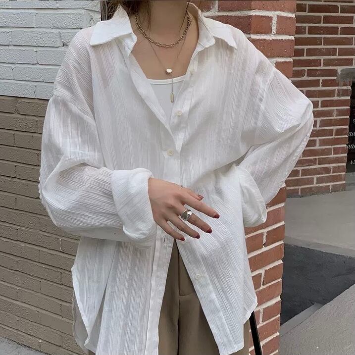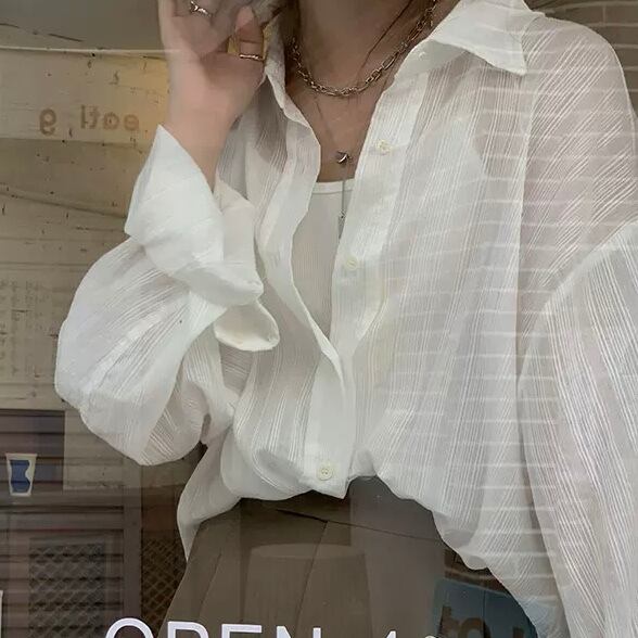 BL-0263 ホワイト ストライプ シースルー シャツ ルーズ 長袖 トップス レディース シンプル 可愛い カジュアル お洒落