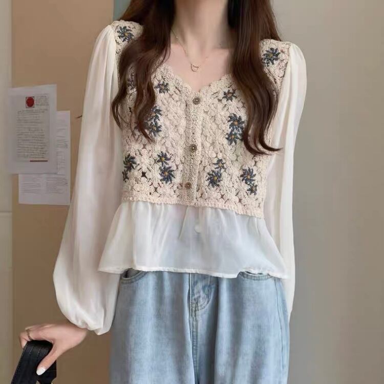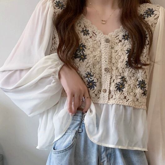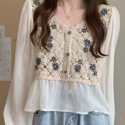 BL-0267 Vネック クロシェ ドッキング 長袖 トップス レディース シンプル 可愛い カジュアル お洒落