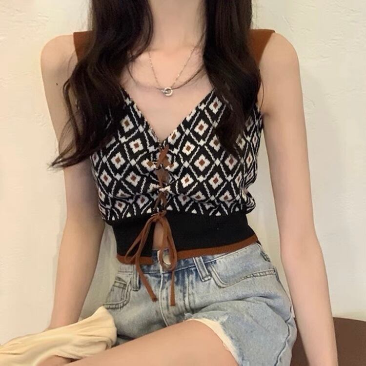 TS-0504 キャミソール レディース ニット チェック ビスチェ アジアン カジュアル トップス シンプル 可愛い お洒落