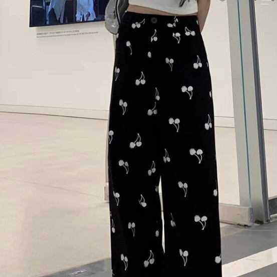 PT-0186 レトロ チェリー スウィート カジュアル ハイウエスト ルーズ パンツ ロング丈 シンプル 可愛い お洒落