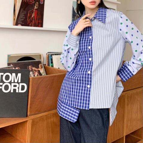 BL-0272 ドット柄 ストライプ チェック パッチワーク シャツ レディース カジュアル トップス シンプル 可愛い お洒落