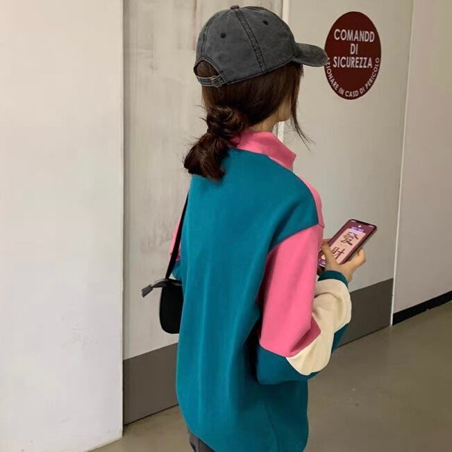 TS-0525 ステッチ ポップカラー ハイネック レトロ スポーティトレーナー 長袖 レディース カジュアル トップス シンプル 可愛い お洒落
