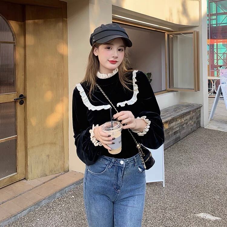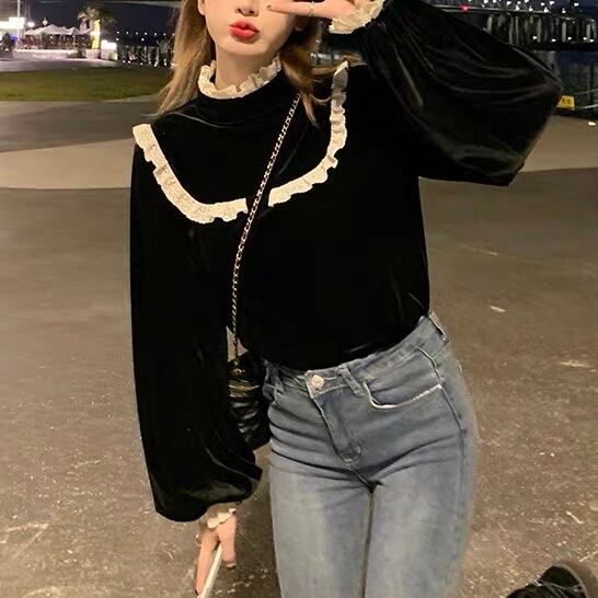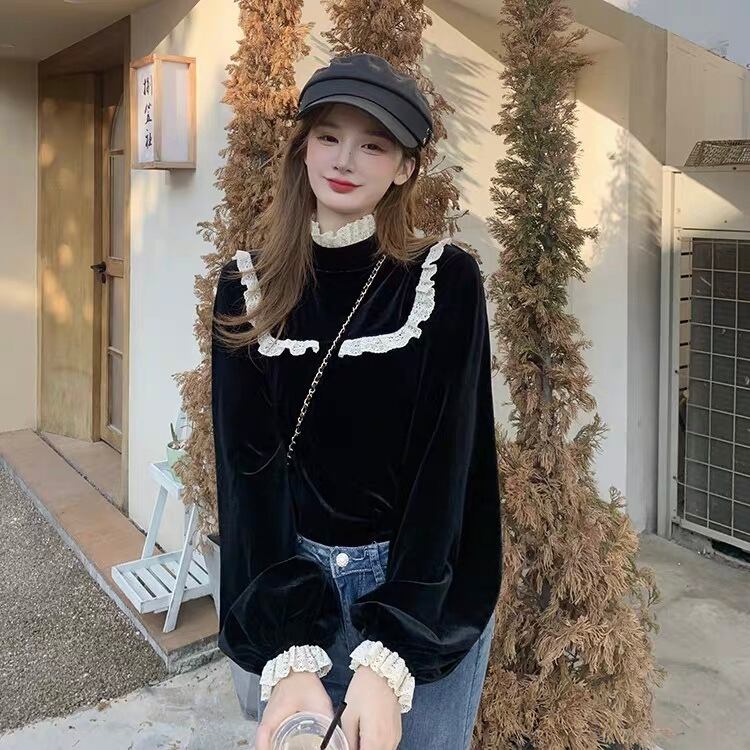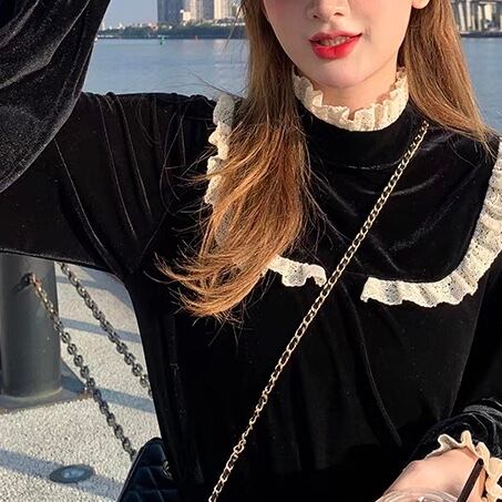 TS-0528 ベルベット ハイネック フリル レトロ レディース カジュアル トップス シンプル 可愛い お洒落