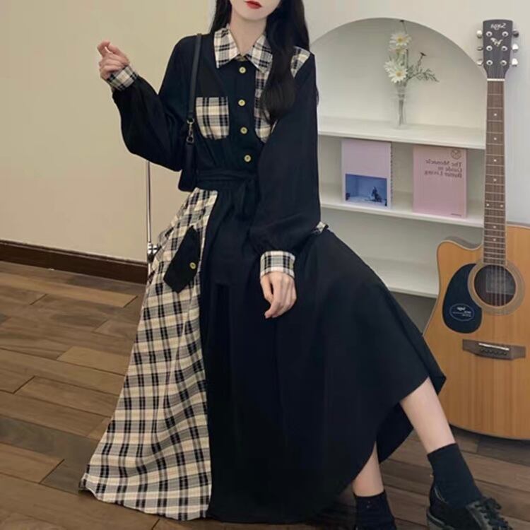 OP-0101 チェック柄 ステッチ イレギュラー 膝下丈 長袖 ワンピース シンプル 可愛い お洒落 カジュアル 上品