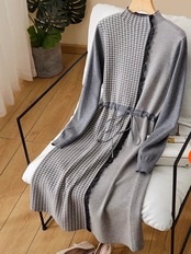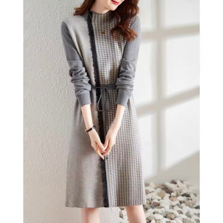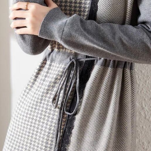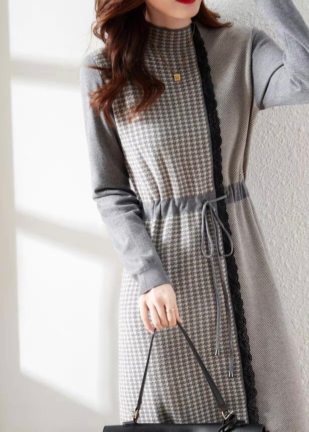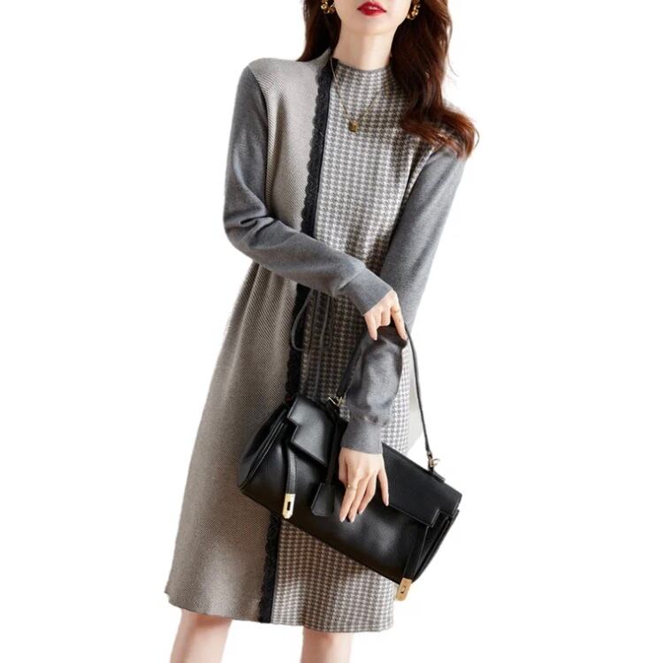 OP-0111 グレー 千鳥格子 ニット シャツ ワンピース 膝丈 長袖 シンプル 可愛い お洒落 カジュアル 上品