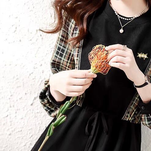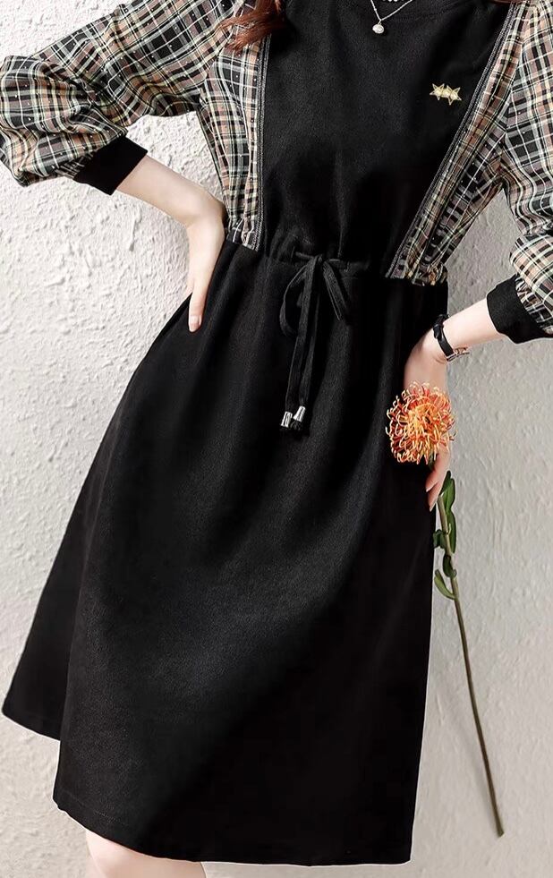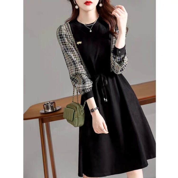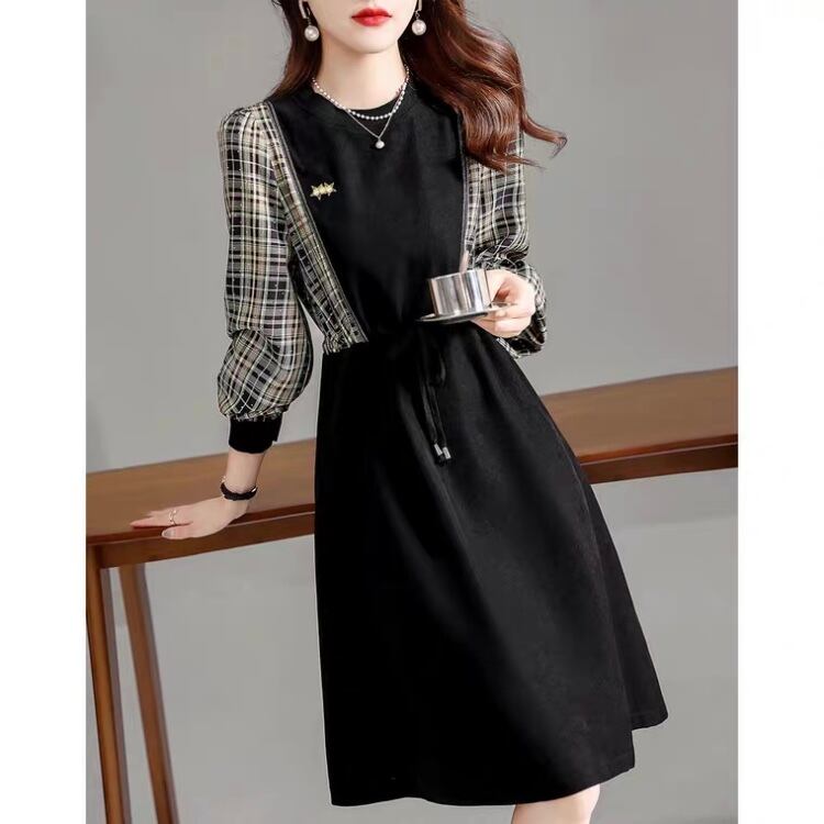 OP-0113 チェック ブラウン 楽ちん ウエストマーク ワンピース 膝丈 長袖 シンプル 可愛い お洒落 カジュアル 上品