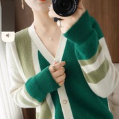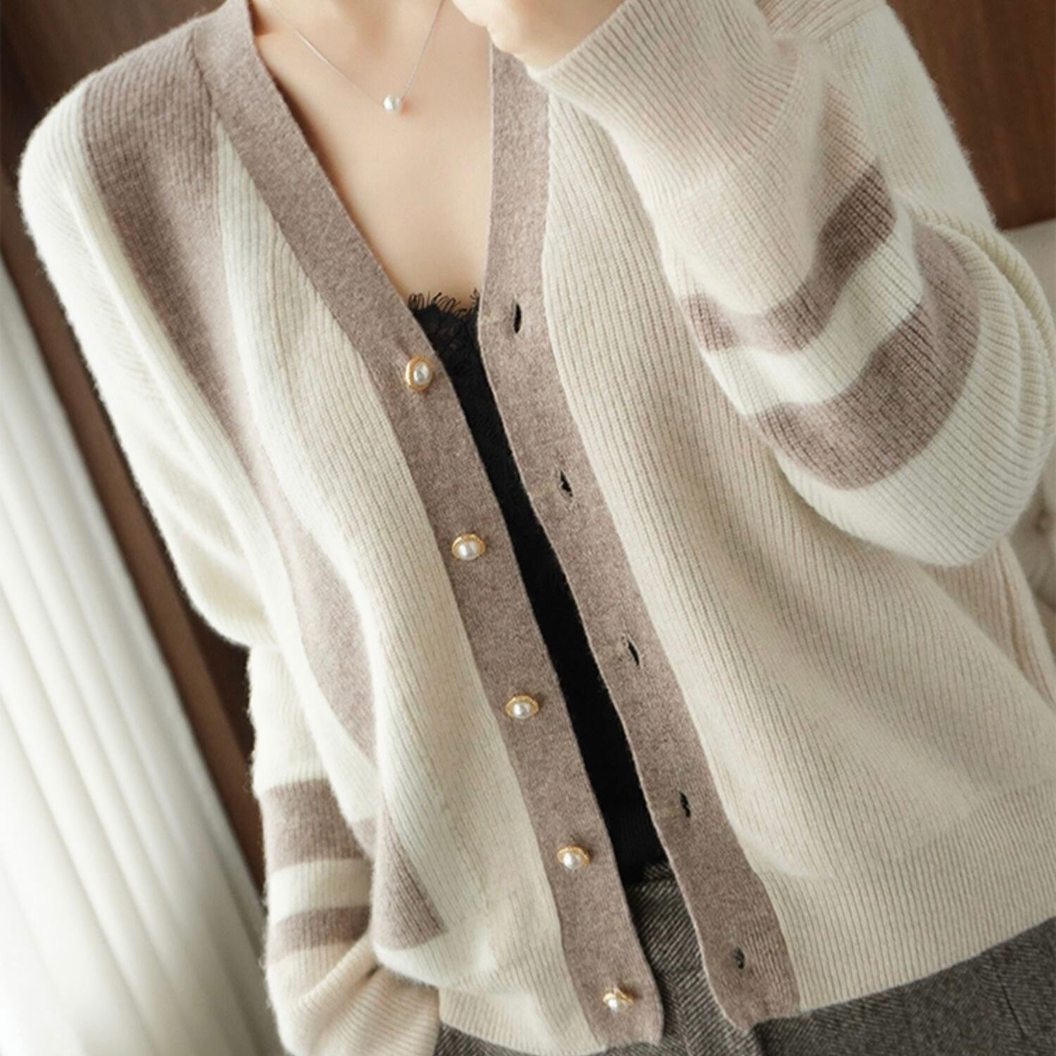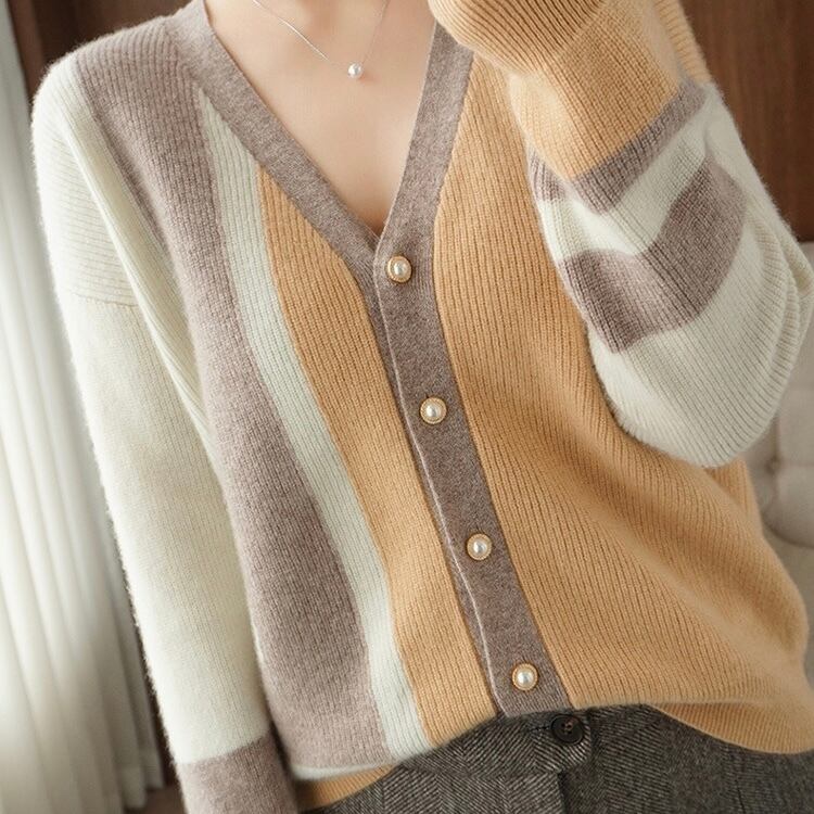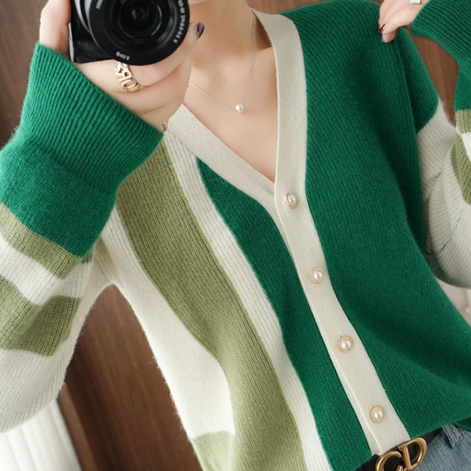 NT-0002 配色 コントラストカラー Vネック ニット カーディガン レディース カジュアル トップス シンプル 可愛い 上品 お洒落