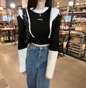 TS-0008 バイカラー ショート丈 ニット ラウンドネック 長袖 レディース カジュアル トップス シンプル 可愛い お洒落