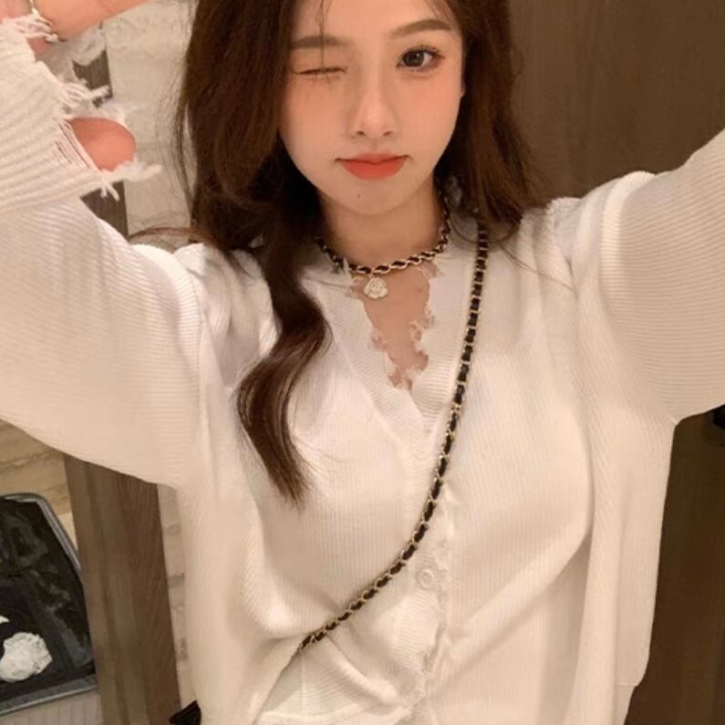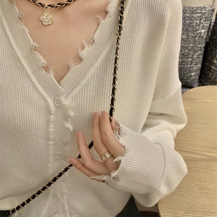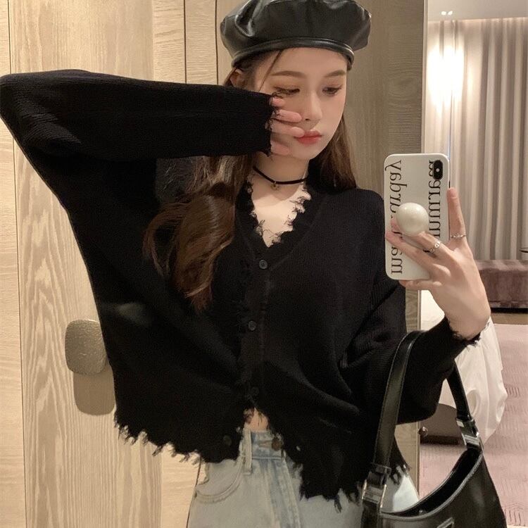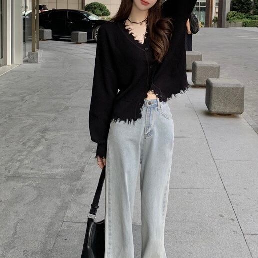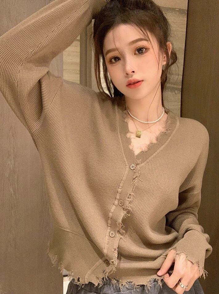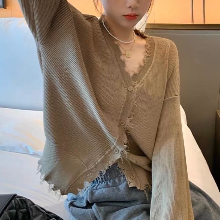 NT-0029 Vネック ダメージ風 カーディガン ニット レディース カジュアル トップス シンプル 可愛い クール お洒落