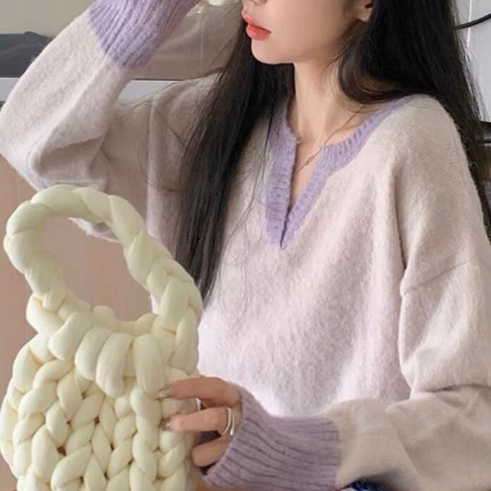 NT-0035 バイカラー パープル ニット レディース カジュアル トップス シンプル 可愛い ナチュラル お洒落