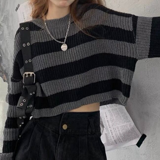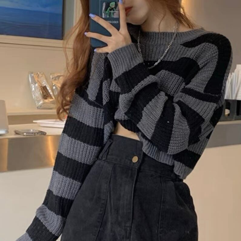 NT-0037 グレー ボーダー クロップド ニット レディース カジュアル トップス シンプル 可愛い ナチュラル お洒落