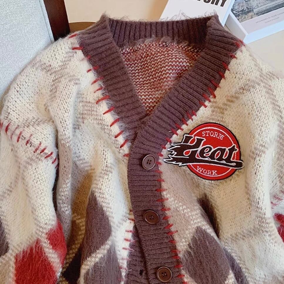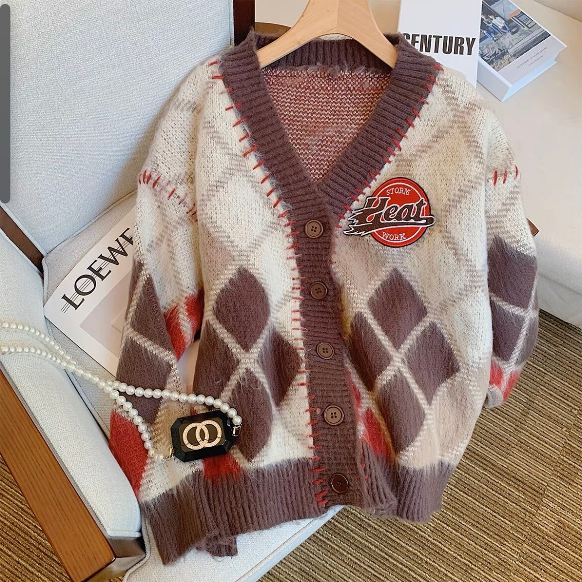 NT-0057 ダイヤモンドチェック レトロ カーディガン ニット レディース カジュアル トップス シンプル 可愛い ナチュラル お洒落