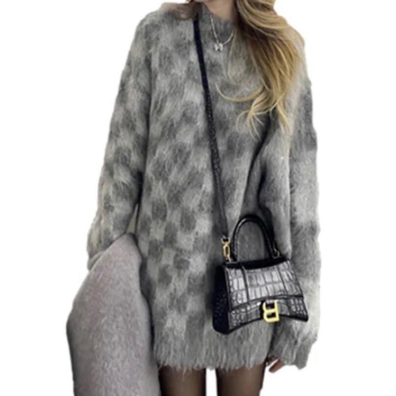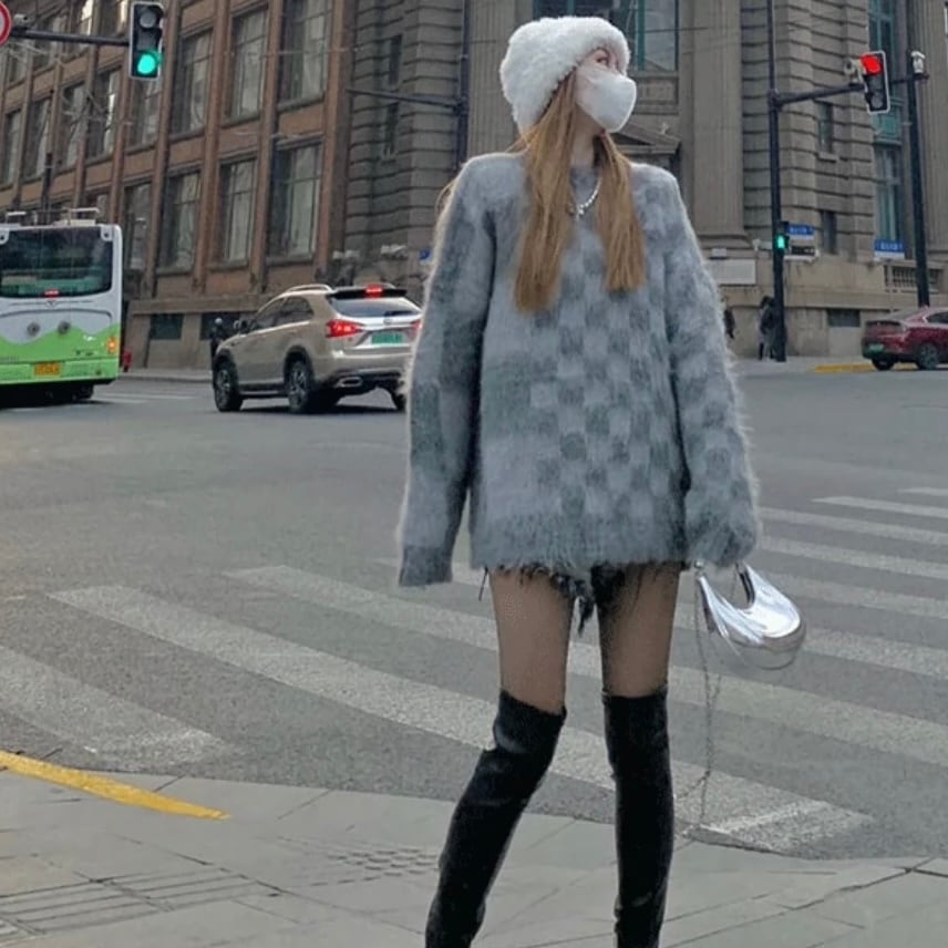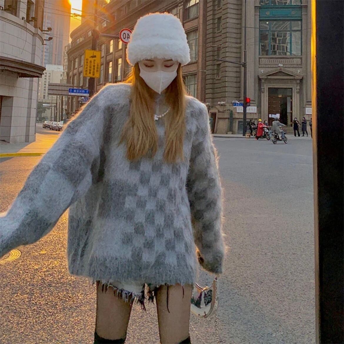 NT-0059 ビンテージ ブロックチェック ニット ルーズ プルオーバー ハーフ レディース カジュアル トップス シンプル 可愛い ナチュラル お洒落