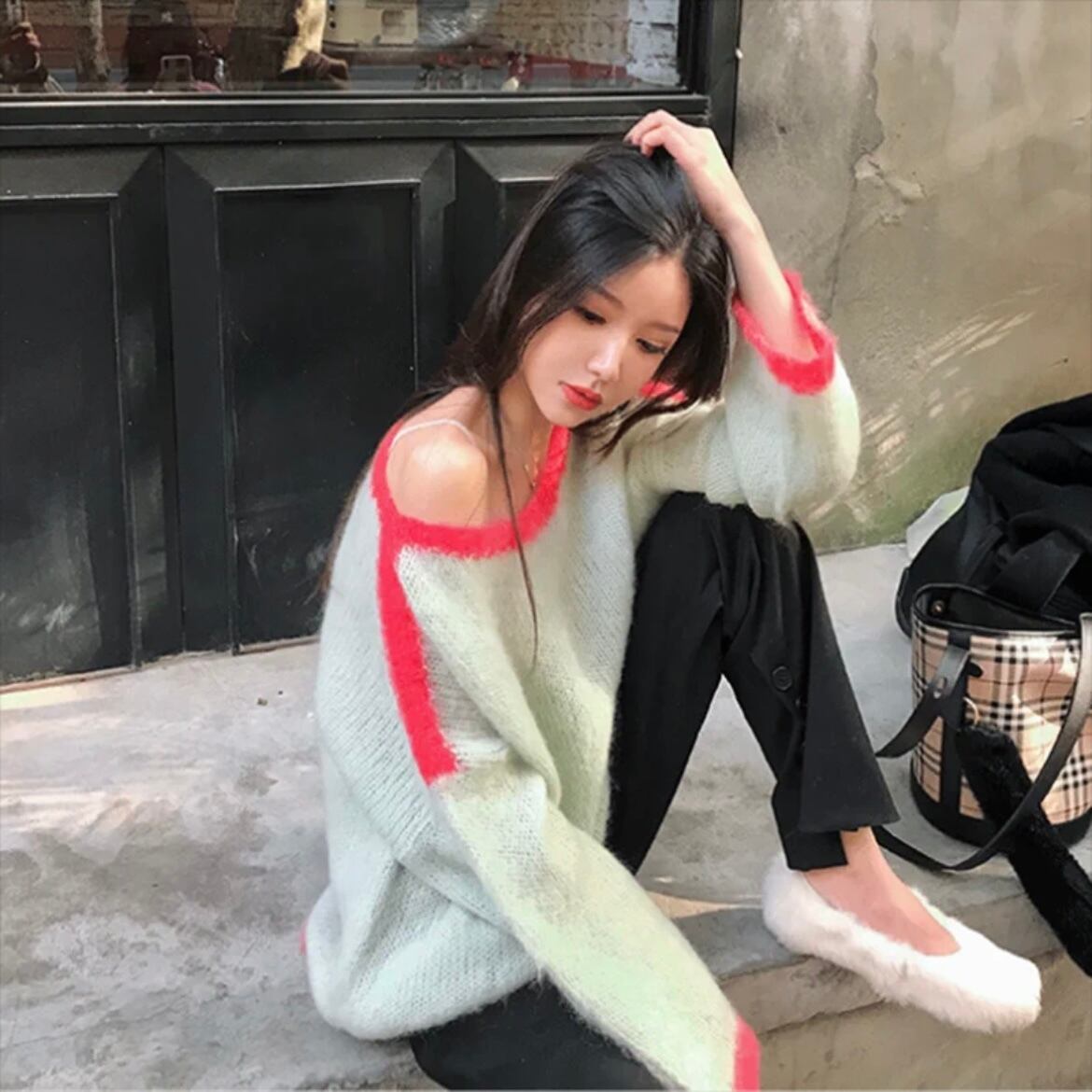 NT-0075 配色 ルーズ ニット レディース カジュアル トップス シンプル 可愛い 上品 ナチュラル お洒落