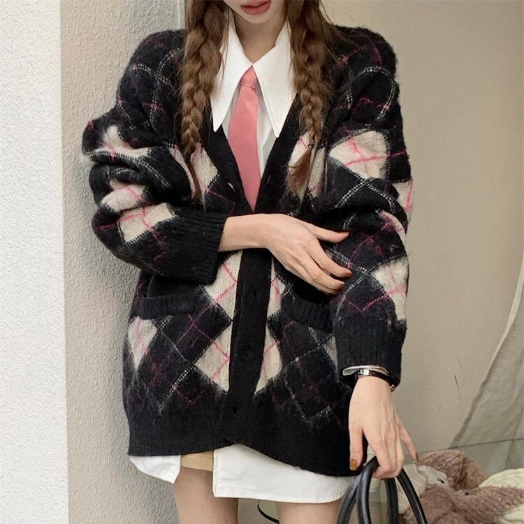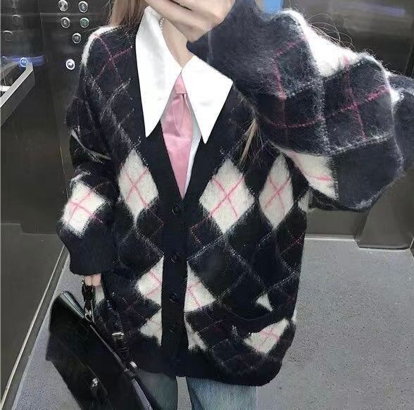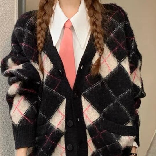 NT-0078 ダイヤチェック柄 ニット カーディガン レディース カジュアル トップス シンプル 可愛い クール ナチュラル お洒落