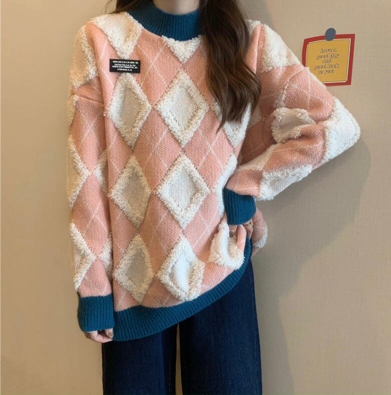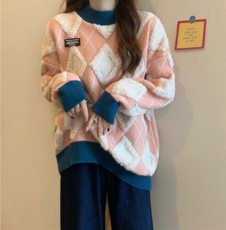 NT-0079 もこもこ ダイヤチェック柄 ラウンドネック ルーズ ニット レディース カジュアル トップス シンプル 可愛い クール ナチュラル お洒落
