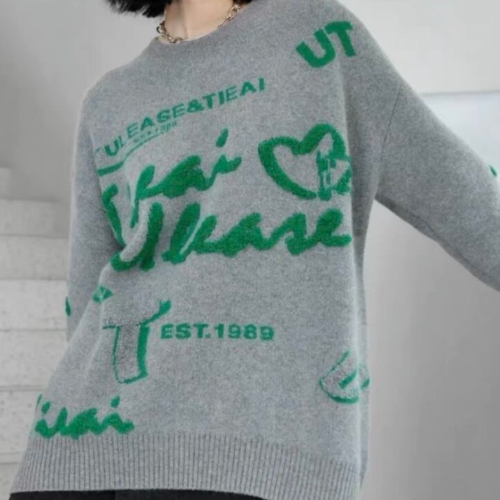 NT-0083 英字 柄 ニット ラウンドネック レディース カジュアル トップス シンプル 可愛い クール ナチュラル お洒落