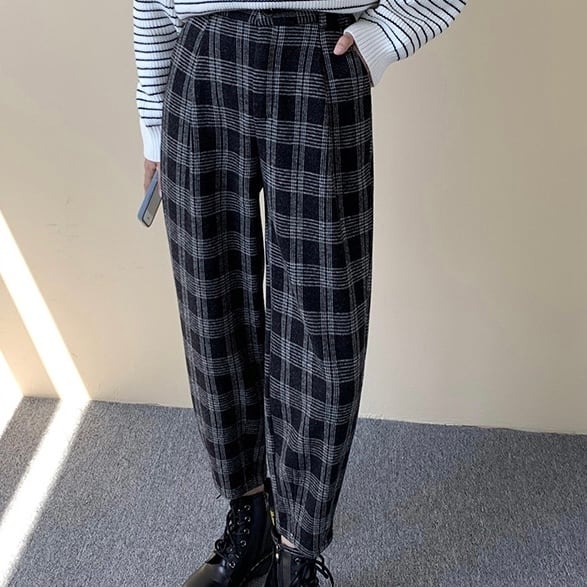 PT-0006 9分丈 チェック 秋冬 ワイドストレート ハイウエストパンツ カジュアルパンツ レディース シンプル 可愛い お洒落 カジュアル