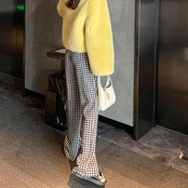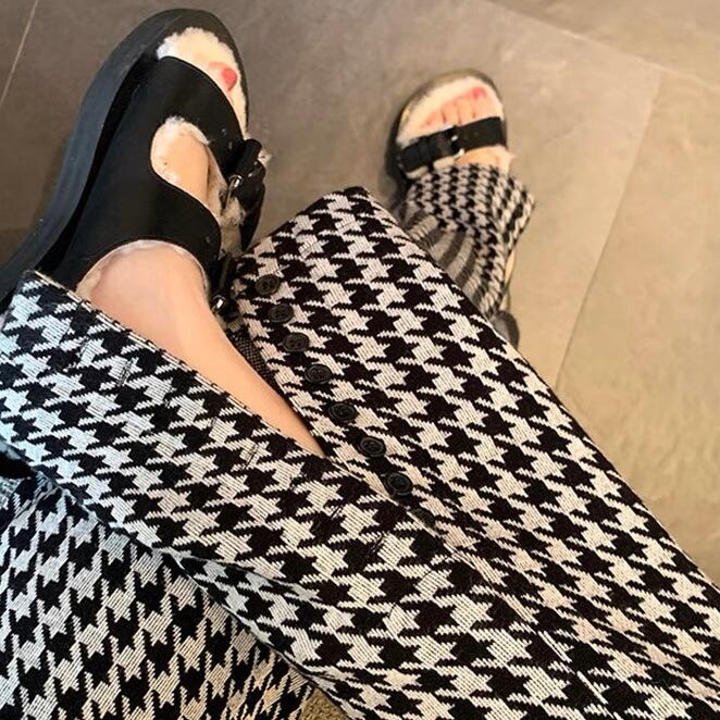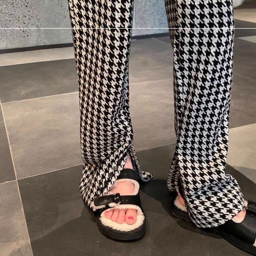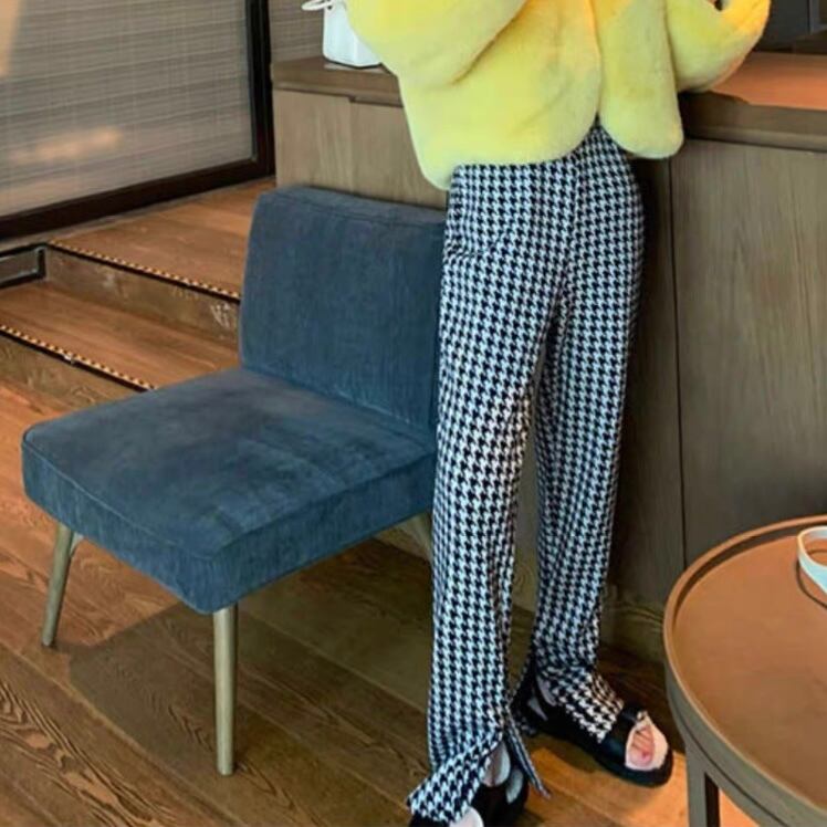 PT-0008 千鳥柄 スリット ニット ストレートスリム カジュアルパンツ レディース シンプル 可愛い お洒落 カジュアル