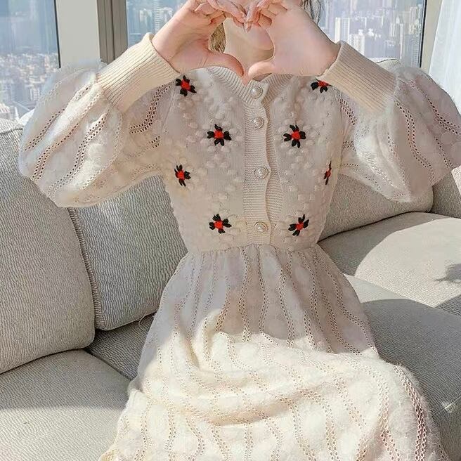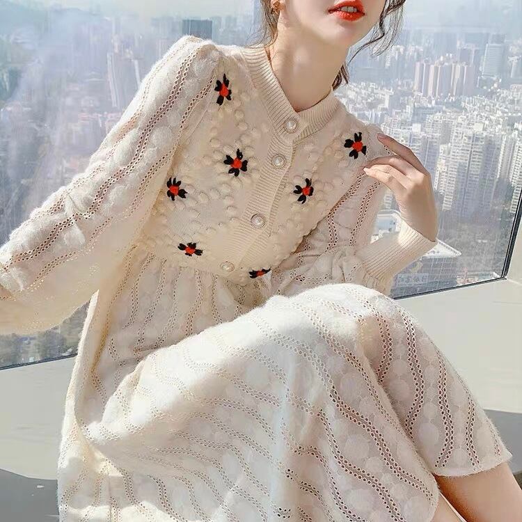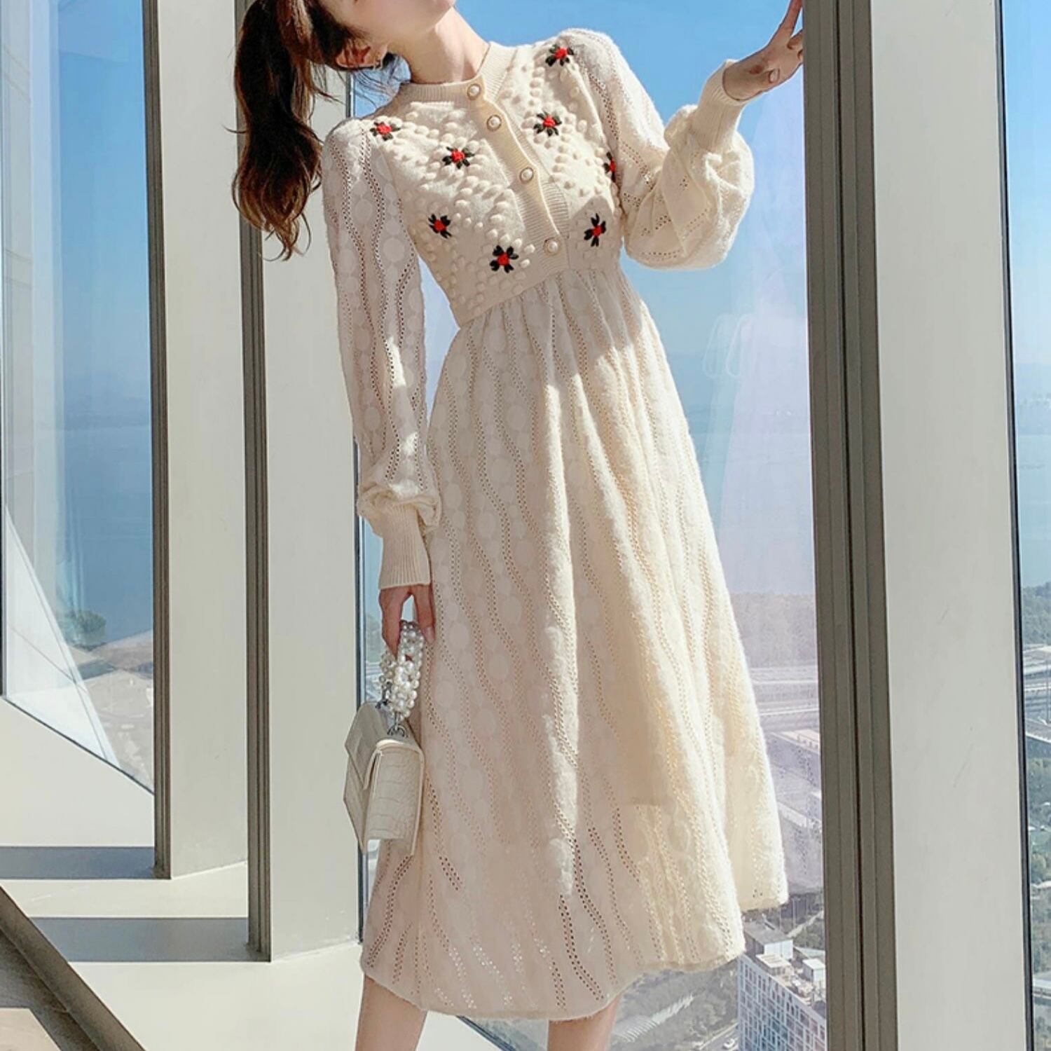 OP-0044 花 ウエストリボン 上品 ワンピース 膝下丈 長袖 レディース カジュアル シンプル 可愛い ナチュラル お洒落
