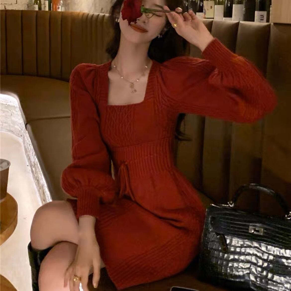 OP-0063 スクエアネック 上品 ニット ワンピース ショート丈 長袖 レディース カジュアル シンプル 可愛い ナチュラル お洒落