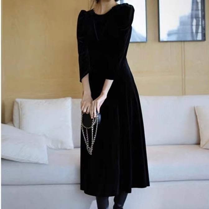 OP-0116 ベルベット ラウンドネック 背中あき 上品 ワンピース 膝下丈 長袖 レディース カジュアル シンプル 可愛い ナチュラル お洒落