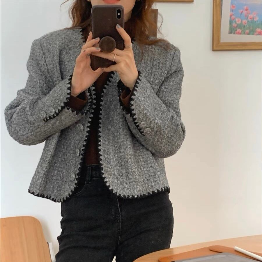 JK-0013 ツイード 配色 ルーズフィット ハーフコート ジャケット レディース カジュアル シンプル 可愛い お洒落 上品 クール