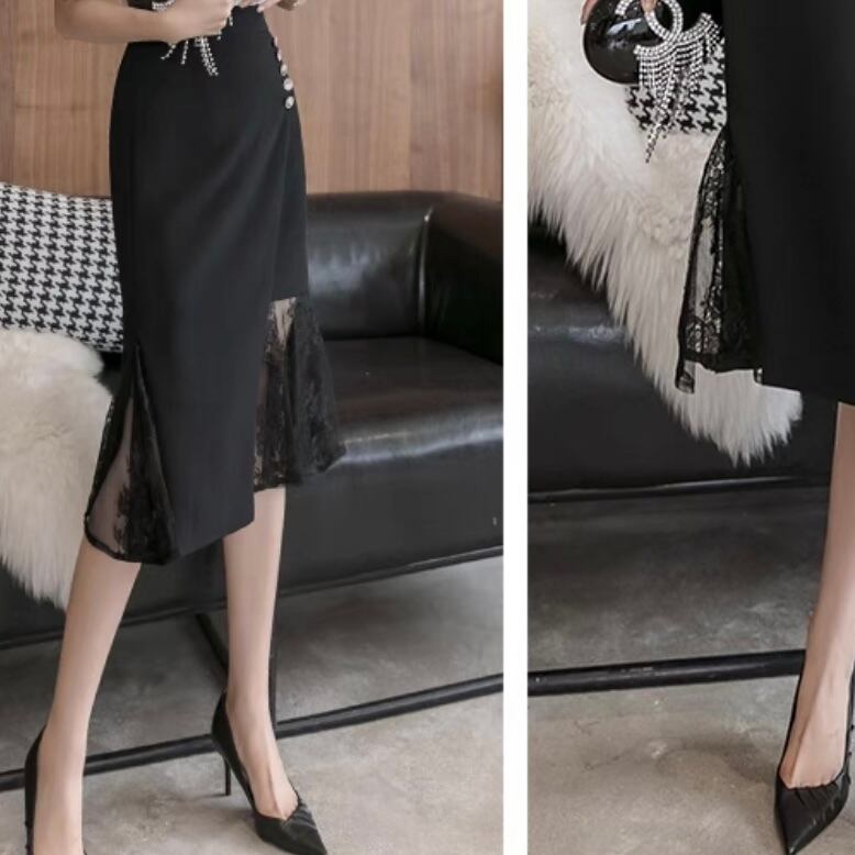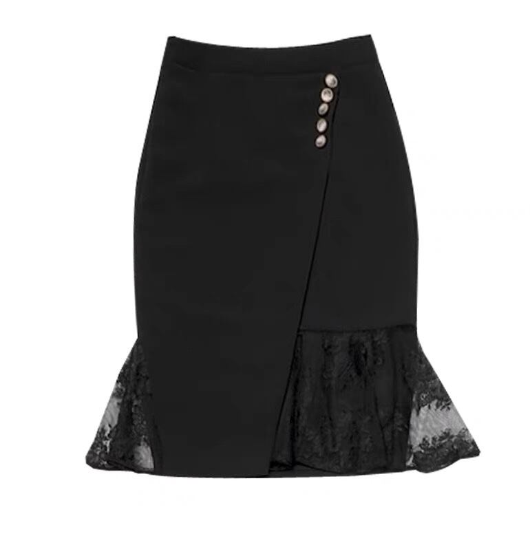 SK-0011 スカート ミディ丈 レースパッチ フィッシュ シースルー ブラック ハイウエスト カジュアル レディース シンプル 可愛い お洒落