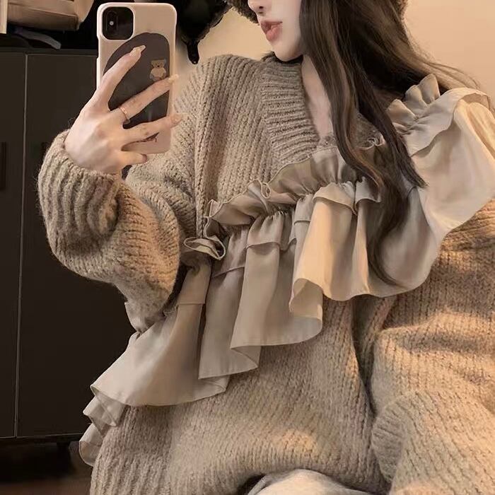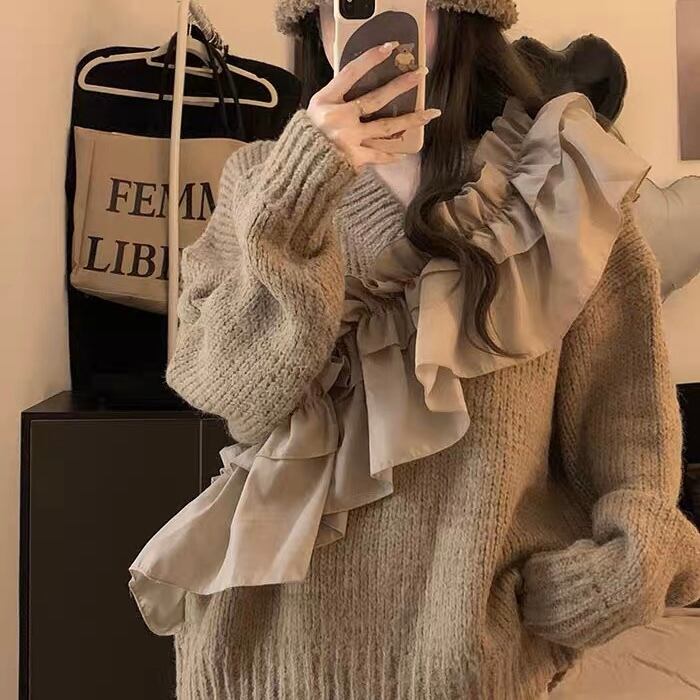 NT-0095 ベージュ ニット フリル パッチ ふわふわ 長袖 レディース カジュアル シンプル 可愛い ナチュラル お洒落