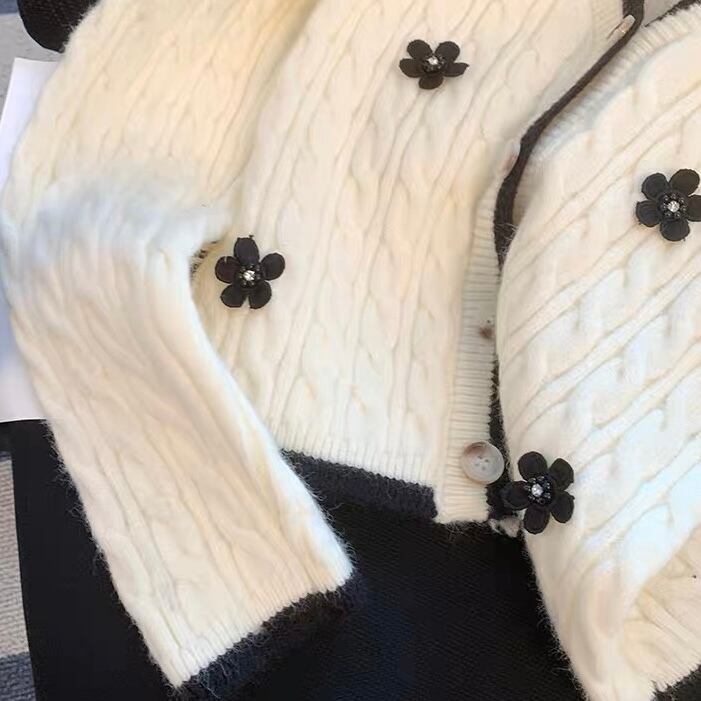 NT-0115 バイカラー 花 ニット カーディガン 長袖 レディース カジュアル シンプル 可愛い ナチュラル お洒落