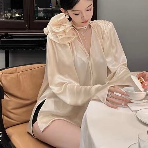 BL-0005 フラワー Vネック ブラウス シャツ ガーリー カジュアル レディース シンプル 可愛い お洒落 上品