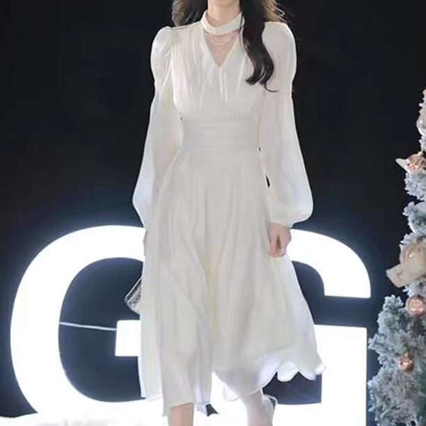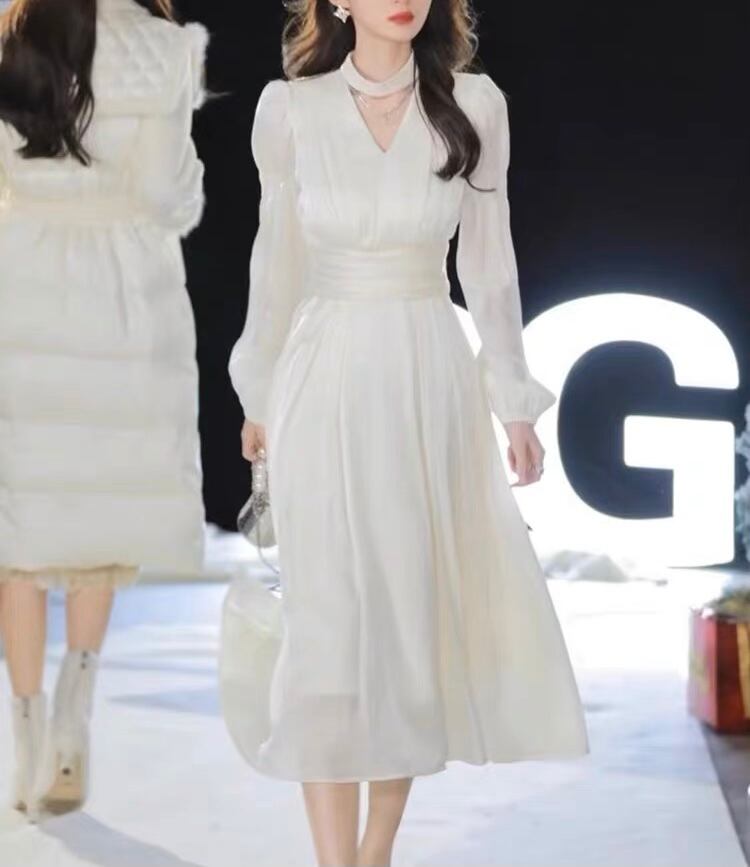 OP-0003 膝下丈 フレア Vネック ホワイト ワンピース オールインワン レディース カジュアル シンプル 可愛い ナチュラル お洒落