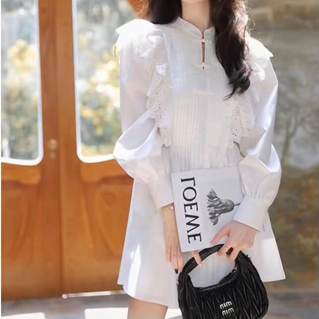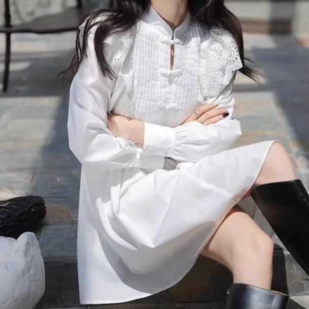 OP-0008 チャイナボタン ショート丈 長袖 フリル シャツ ワンピース オールインワン レディース カジュアル シンプル 可愛い ナチュラル お洒落