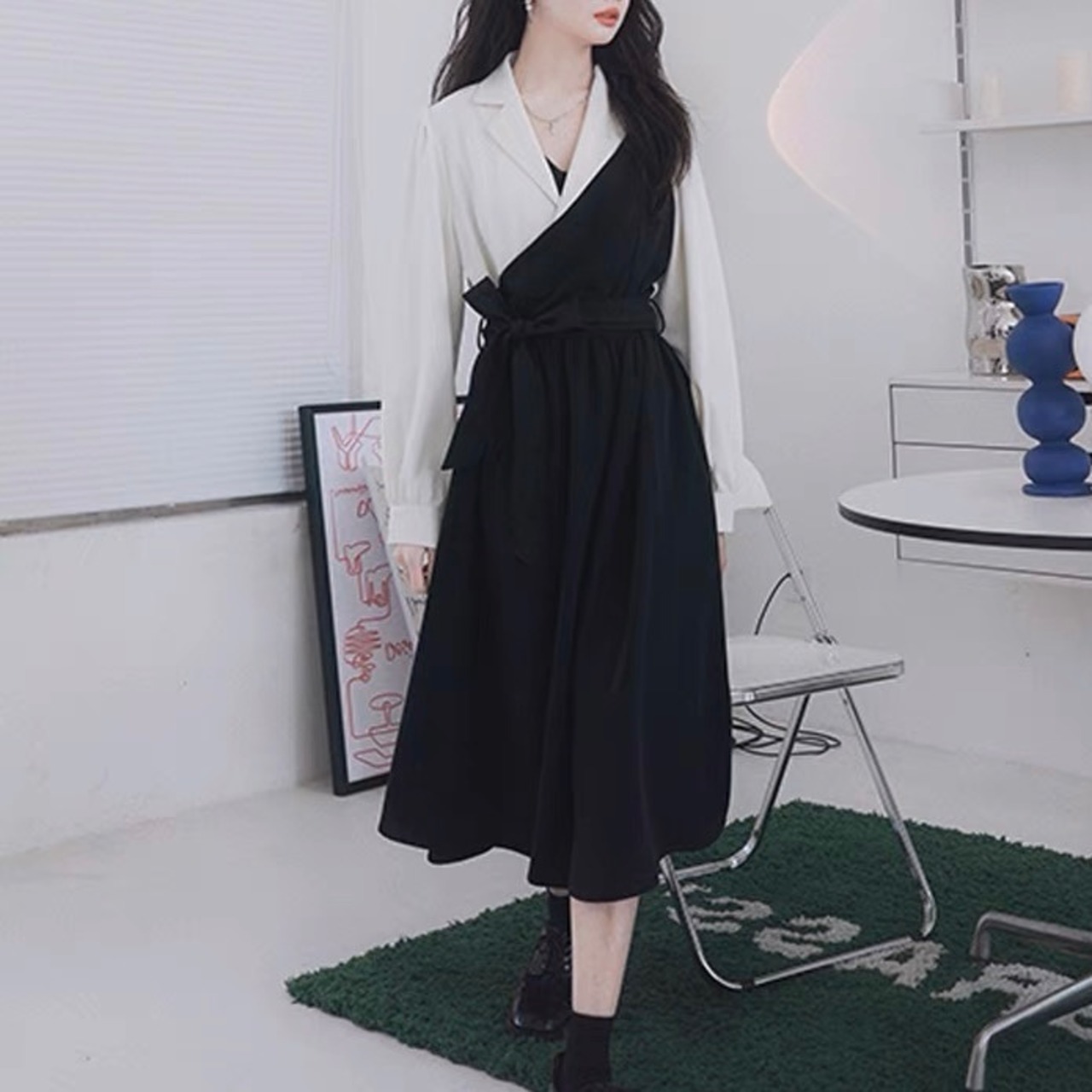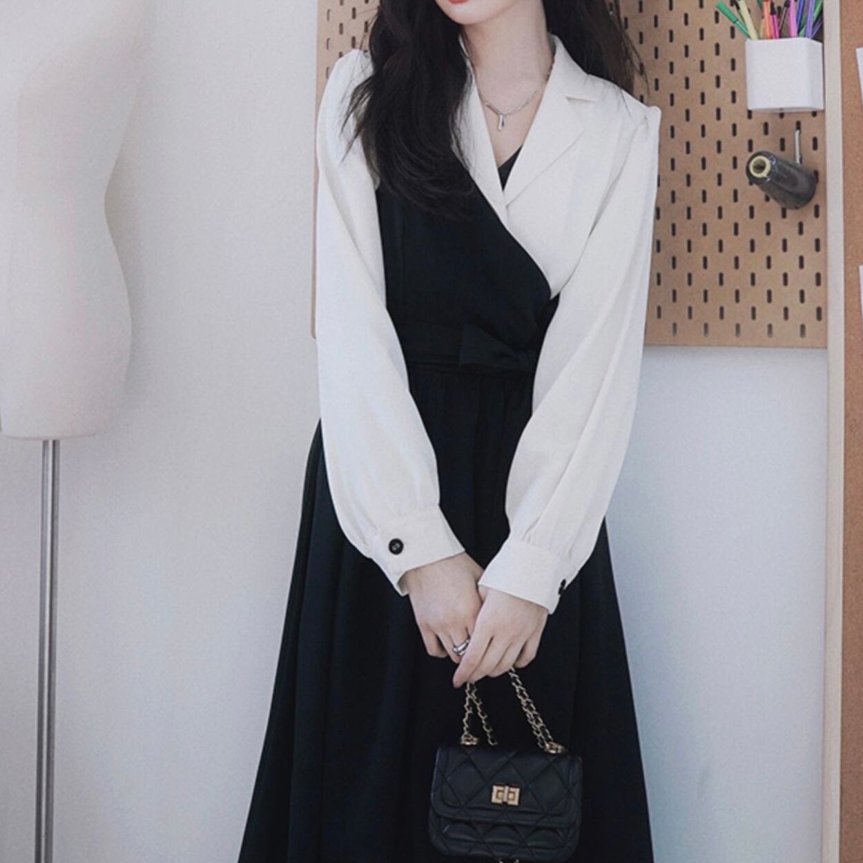 OP-0013 ブラック ホワイト パッチ 膝下丈 シャツ ワンピース オールインワン レディース カジュアル シンプル 可愛い ナチュラル お洒落