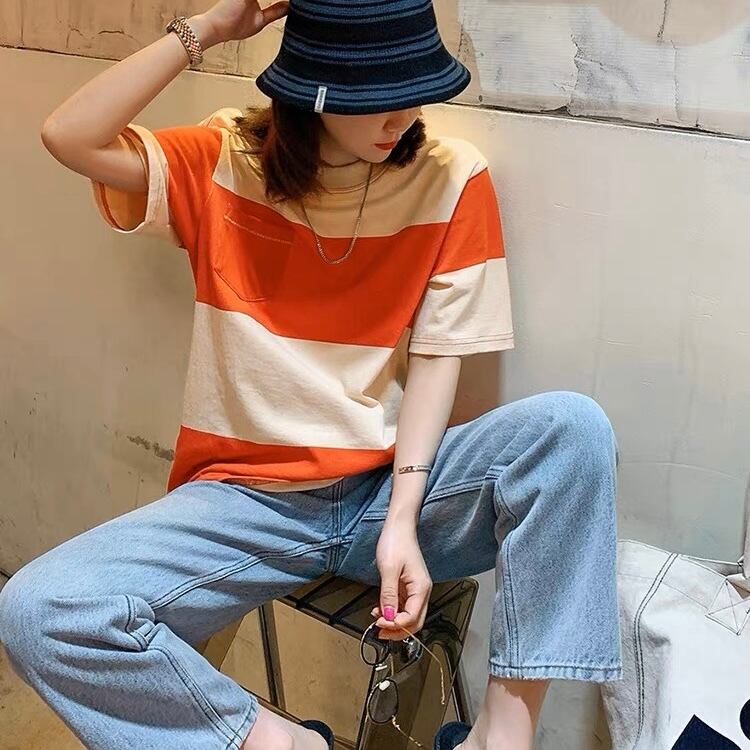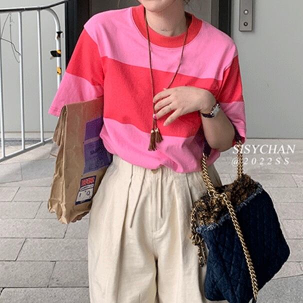 TS-0053 ルーズフィット ストライプ ラウンドネック Tシャツ トップス 半袖 レディース カジュアル シンプル 可愛い ポップ お洒落