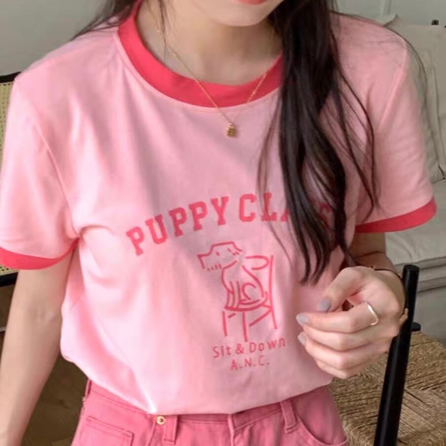 TS-0056 バイカラー イラスト 犬 Tシャツ トップス 半袖 レディース カジュアル シンプル 可愛い ポップ お洒落