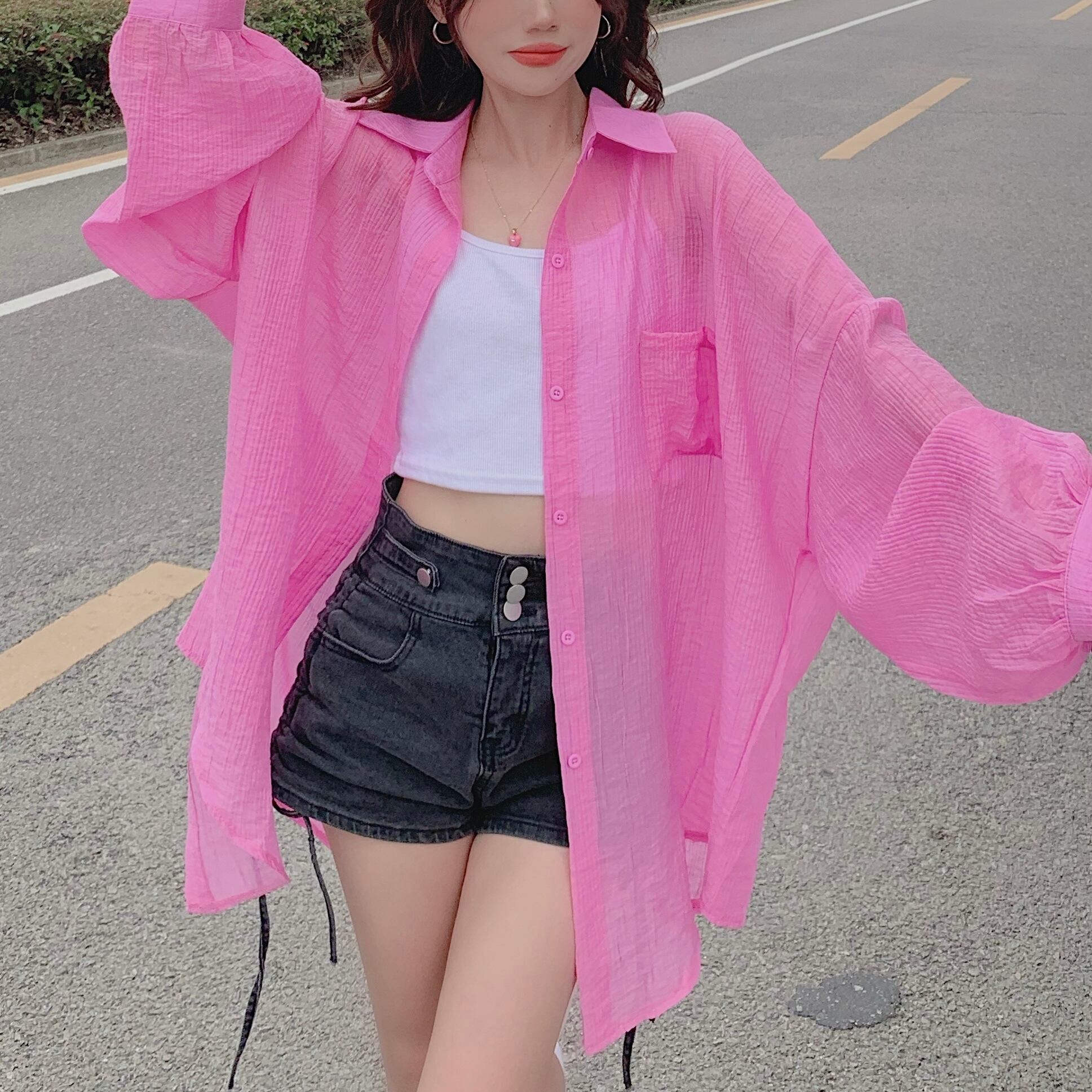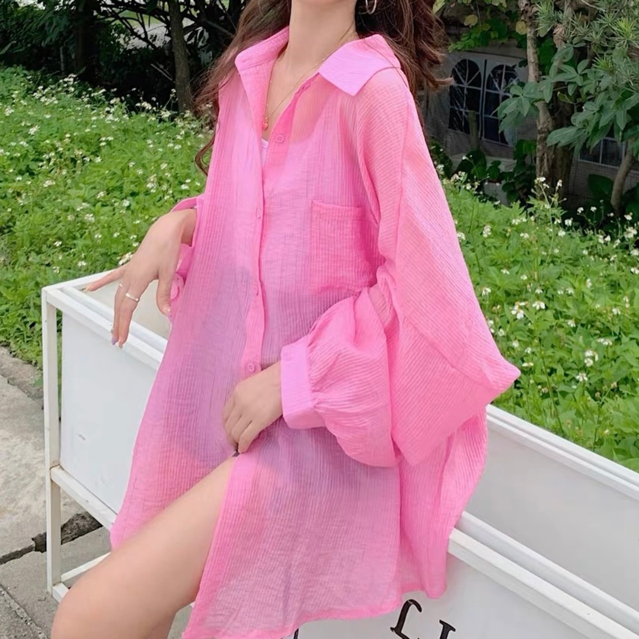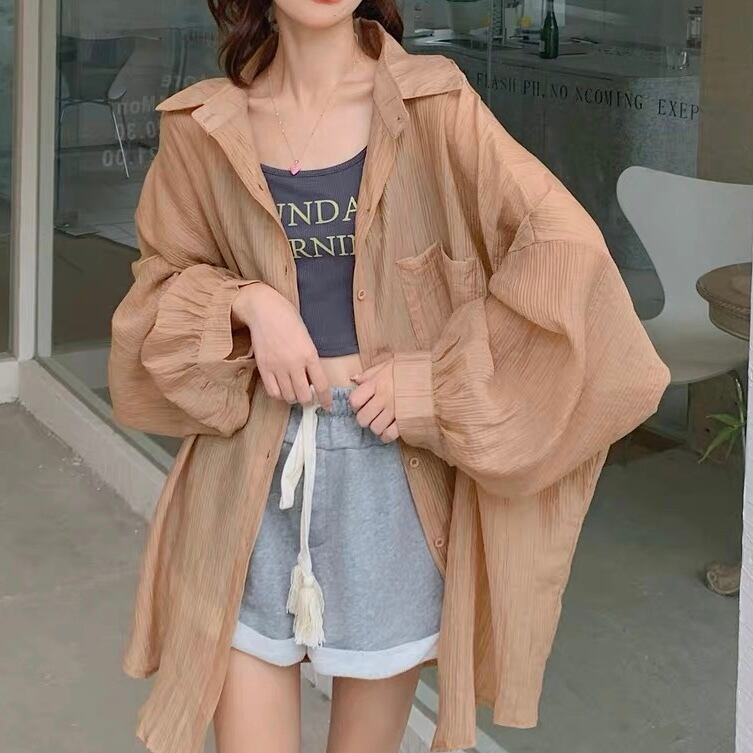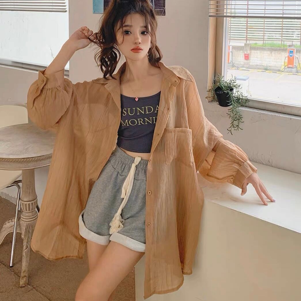 BL-0019 オーバーサイズ ルーズフィット カラー シースルー シャツ トップス 長袖 レディース カジュアル シンプル 可愛い 上品 お洒落