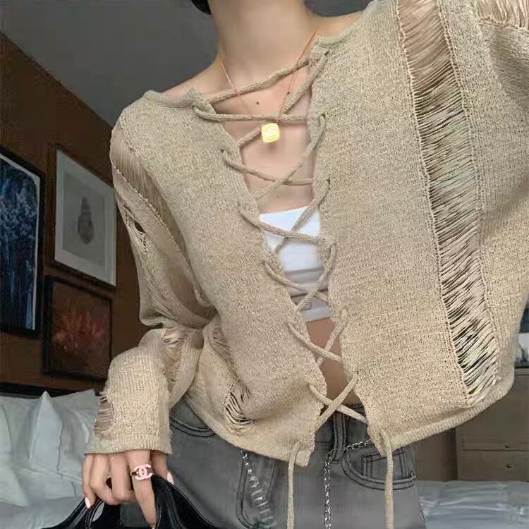 NT-0124 レースアップ ダメージ ショート丈 ニット トップス レディース カジュアル シンプル 可愛い お洒落