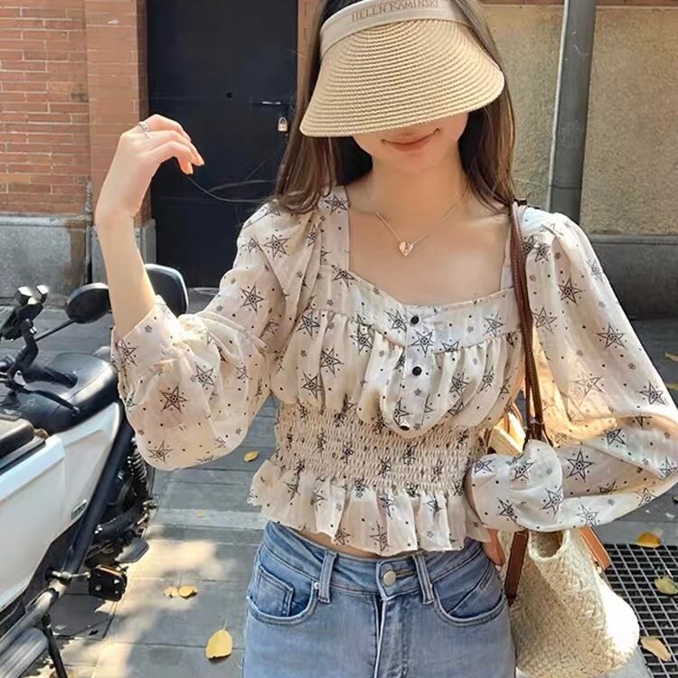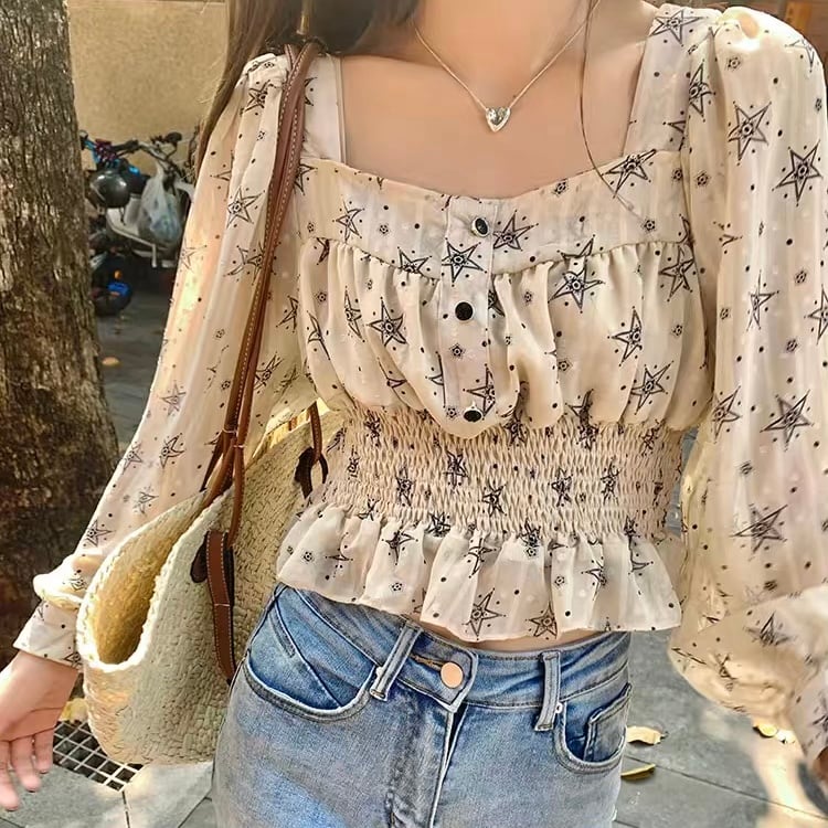 TS-0069 星 スクエアネック ショート丈 フリル ブラウス トップス レディース カジュアル シンプル 可愛い 上品 お洒落 きれいめ