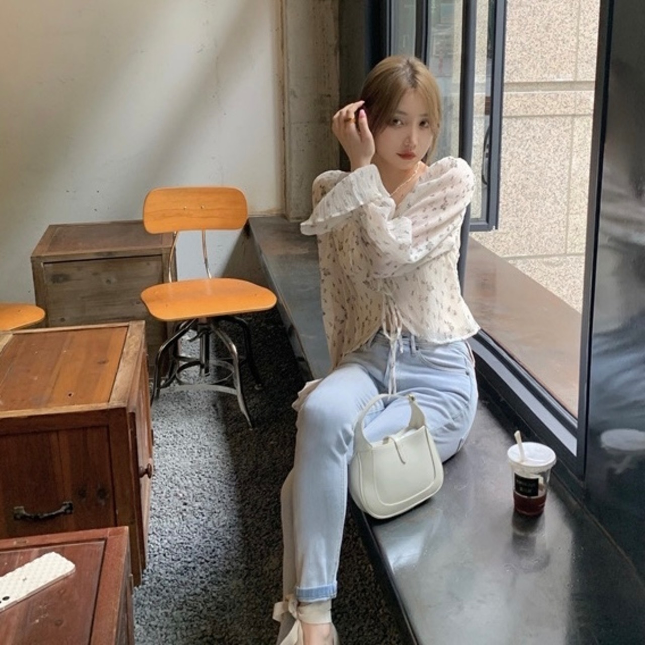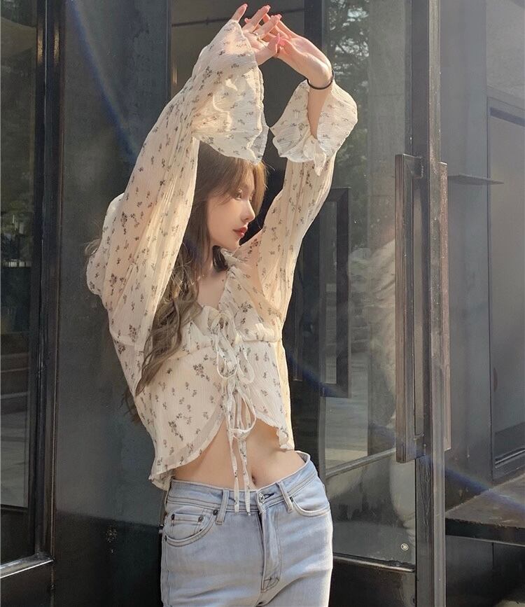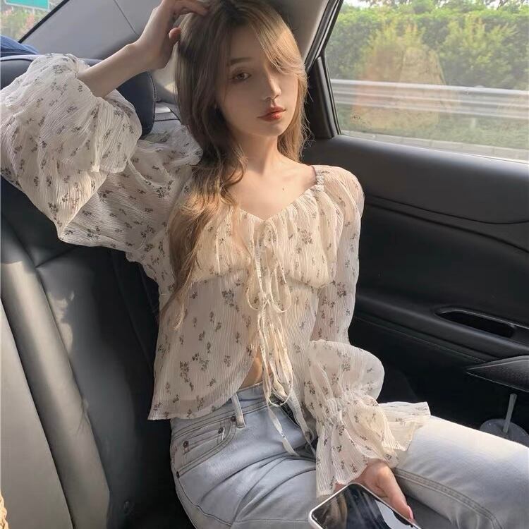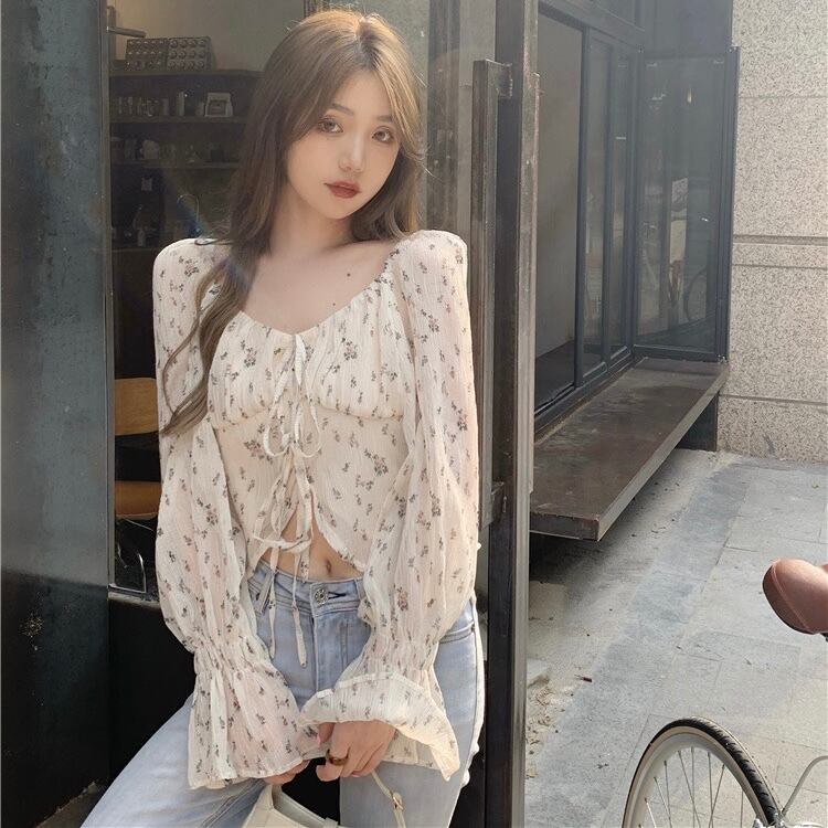 TS-0072 長袖 フレア袖 リボン 花柄 トップス レディース カジュアル シンプル 可愛い 上品 お洒落 きれいめ