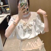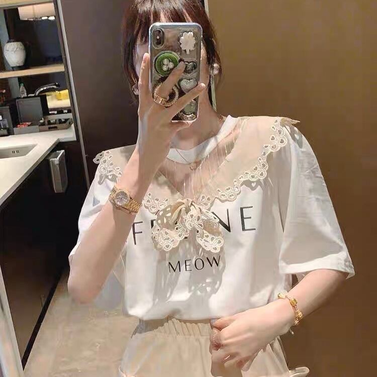 TS-0075 フリル襟 半袖 レタリング Tシャツ トップス レディース カジュアル シンプル 可愛い 上品 お洒落 きれいめ